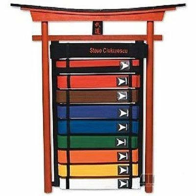 Solid wood with a black and red semi-gloss finish. Features a hand painted Kanji symbol which means “Budo.” Belts are held in place by elastic straps on 1-7/8″ slats. Hanging hardware included. Belts not included. Measures 29-1/2″ x 25-1/2″ x 2″.