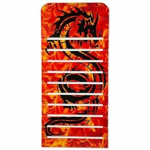 This ten level belt display features a wood frame with elastic bands and a black fire dragon design. Display can mount on wall. Dimensions: 30″ x 14″