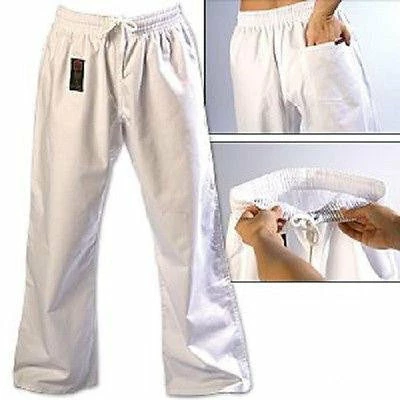 These boxer style, contact pants feature a 2″ wide elastic waist with a rear pocket, outside drawstring and gusseted crotch. Cut extra long with hem. Constructed from an 8 oz. cotton/polyester twill. Available in sizes 0-7.
