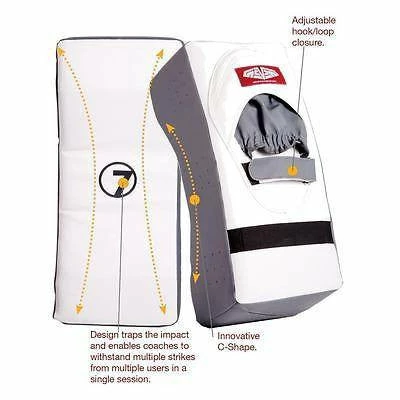 As comfortable and versatile as a coaching mitt, while absorbing more impact than traditional kicking shields. Super light-weight compared to Thai Pads. The Trapper’s innovative C-Shape design literally traps the impact and enables coaches to withstand multiple strikes from multiple users in a single session. Slide your hand into the back of the trapper and secure your wrist with the adjustable hook/loop closure. You can easily shift positions of the trapper for high kicks, knee-strikes and hand strikes. Double up the trappers when you need to endure high impact knee strikes. Excellent for boxing, kickboxing, muay thai and mma training.